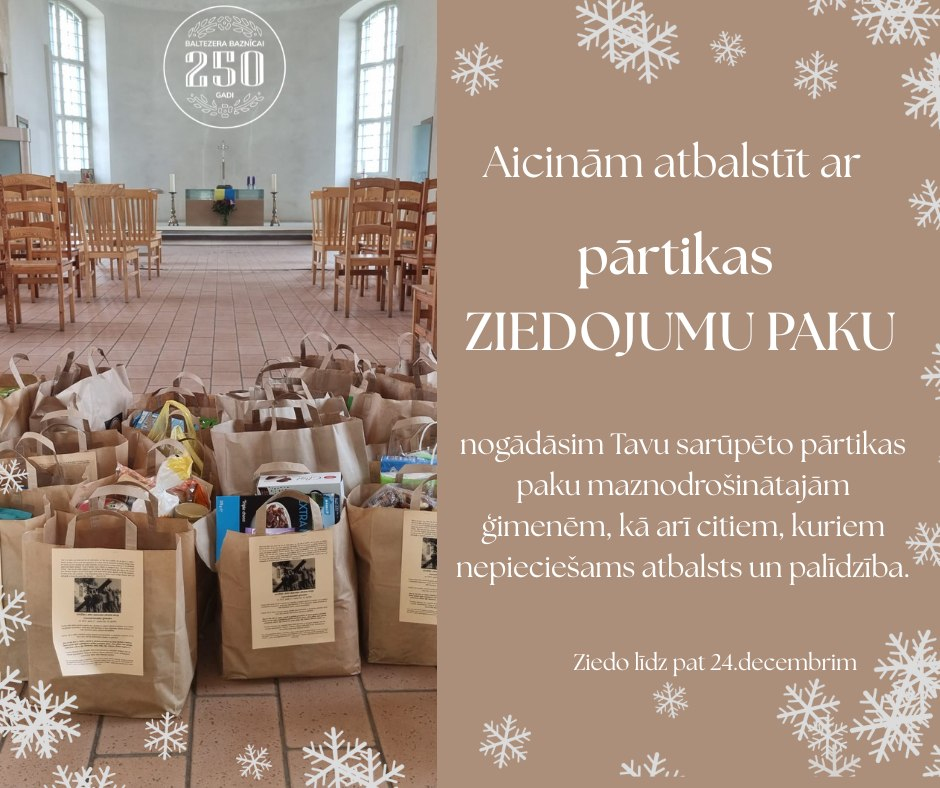 Lūdzam Jūs ar ziedojumu paku atbalstīt maznodrošinātas un daudzbērnu ģimenes, kā arī visus citus, kam ļoti nepieciešams atbalsts un palīdzība. Piepildi pārtikas paku un atnes uz baznīcu.