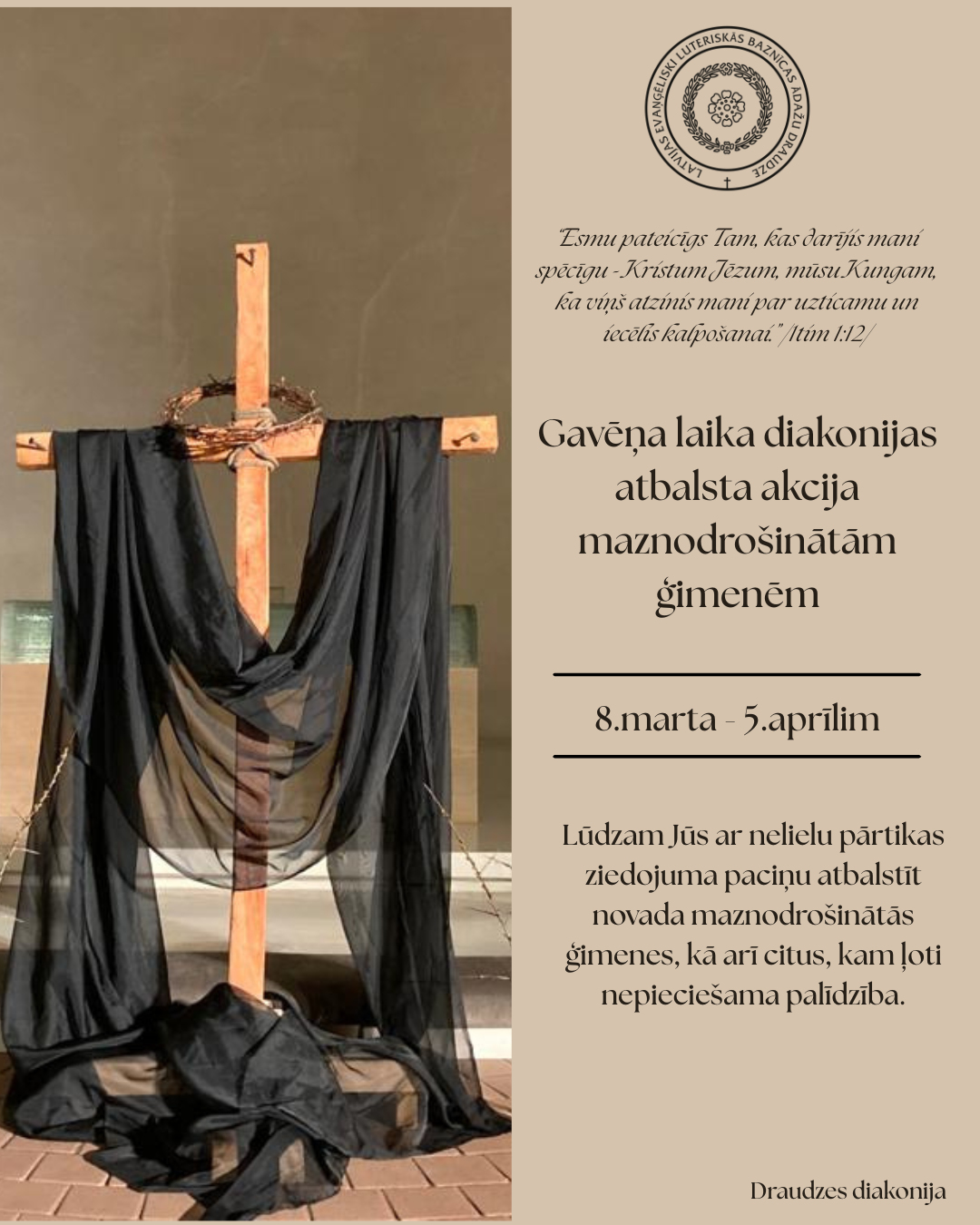 Draudzes diakonija sarūpētās lietas izdalīs ģimenēm un vientuļiem cilvēkiem, kam tās visvairāk ir nepieciešmas. Paciņu ar ziedojumu lūdzam nolikt pirms vai pēc dievkalpojuma pārrunu telpā (pa labi no ieejas baznīcā).